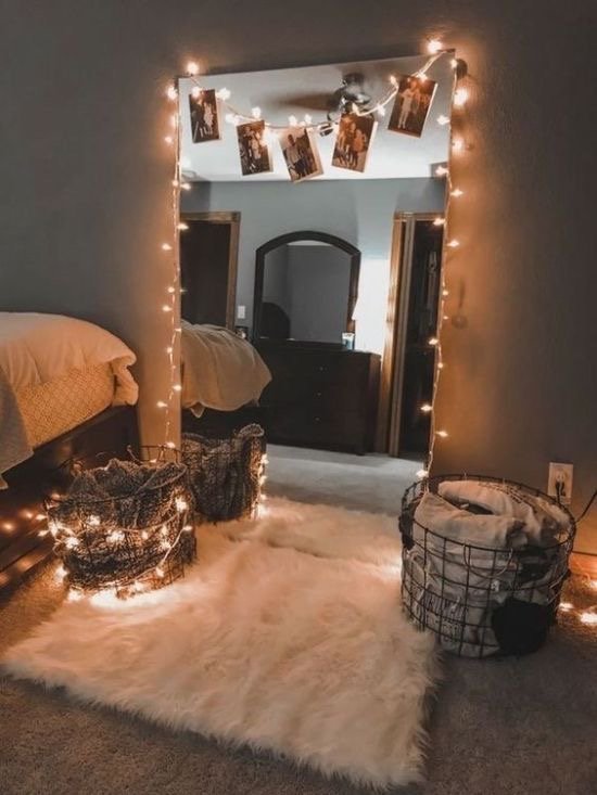 Drehen Sie den Spiegel in die Lichtquelle, entscheidet damit mit einer Girlande von magischen Lichtern. Es wird Glamour hinzufügen und eine Atmosphäre des Hollywood-Make-ups im Zimmer schaffen, sodass Sie Marilyn Monroe fühlen, wenn Sie ihn ansehen.