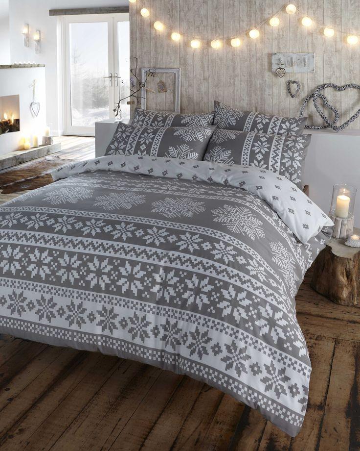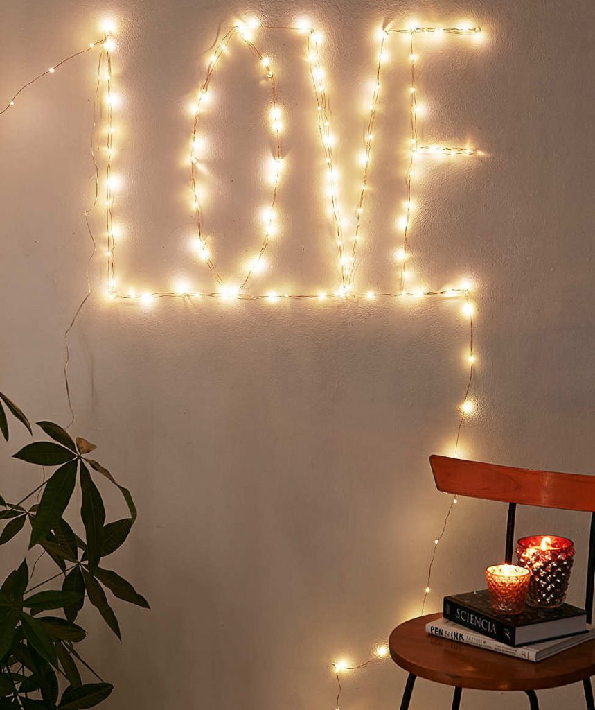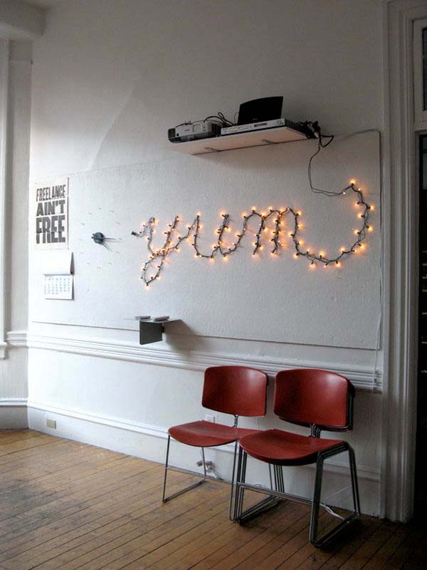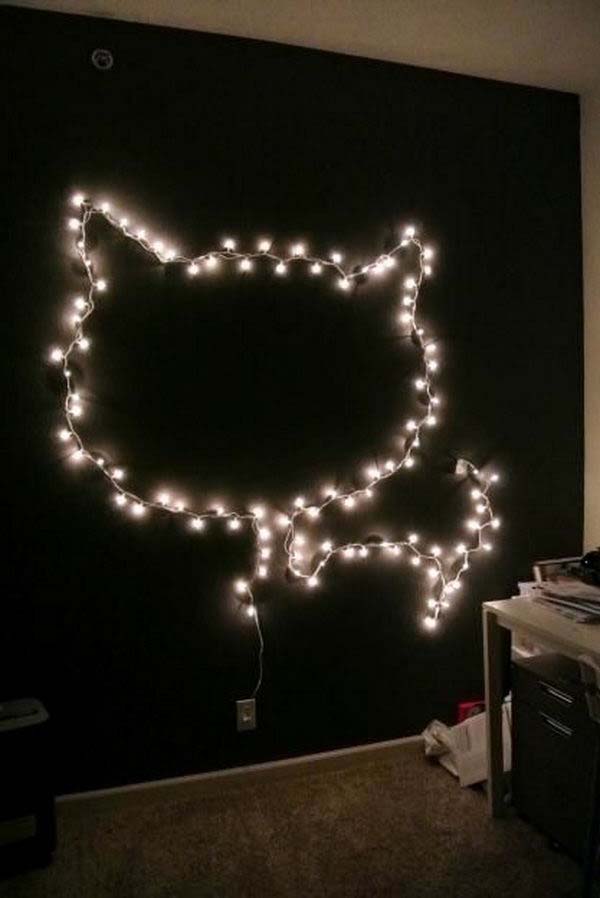 Die Schönheit der Neujahrsgirlanden ist, dass sie irgendein Formular erhalten können. Mit ihrer Hilfe können Sie eine abstrakte Figur an der Wand oder ein vollwertiges Muster zeichnen. Dies kann etwas bestimmtes sein, das dem gemeinsamen Thema Ihres Zimmers entspricht. Eine solche Wandkunst im Schlafzimmer ersetzt leicht das Nachtlicht.