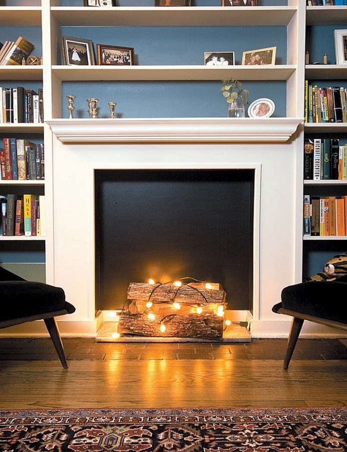 Mit Hilfe der Neujahrsgirlanden können Sie eine Nachahmung von Live-Feuer erstellen. Und es spielt keine Rolle, ob Sie einen echten Kamin in Ihrem Haus haben oder nicht. Es ist möglich, uns auf die dekorativen Bündel von Ästen auf dem Couchtisch einzuschränken, das vom Faden blinkender Lichter verwundet ist. Eine solche Dekoration sieht in jedem Inneren gut aus.
