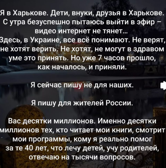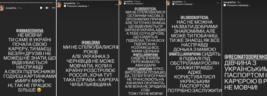 Bei ukrainischen Künstlern, die streng, um Putin und den Krieg zu verurteilen, begann er in der Ukraine: Andriy Fedinchik, Natalka Denisenko, Olga Sumskaya, Sängerin Tina Karol, Svetlana Tarabarova, Alexander Zaritskaya, Jamala, Olya Zarbulka, Iryna Fedishin, Natalya Mogilevskaya, Viktor Pavlik, Artem Pivovarov , Volodymyr-Dantes, Sergey Babkin, TV-Anwesen Grigory Reshetnik, Yuriy Gorbunov, Wladimir Ostapchuk, Glory Demin, von Alan Badoyev und viele andere.