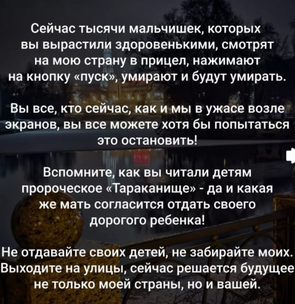 Bekannte ukrainische TV-Moderatorin regelmäßig Video-Aufzeichnungen zur Unterstützung der ukrainischen und Appelle an ihre Kollegen in der Ukraine und in der Welt zu denen zu seinem großen Publikum über den Krieg gesprochen. Stern TV zugegeben, dass ihre Verwandte noch in der Krim und St. Petersburg haben sie nicht in Kontakt gebracht, und das kann nur bedeuten, dass sie die russische Propaganda glauben. Aber Maria hat nicht die Hoffnung verlieren kann zu erreichen, um Millionen von anderen Menschen in Russland povplyvaty die Situation zahovoryvshy laut, dass Putin den Krieg beenden sollte. Sie appellierte auch an Tina Kandelaki und Nikolai Baskov Putins Invasion der Ukraine zu unterstützen.