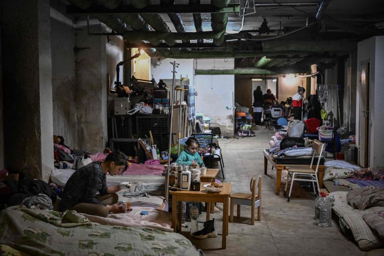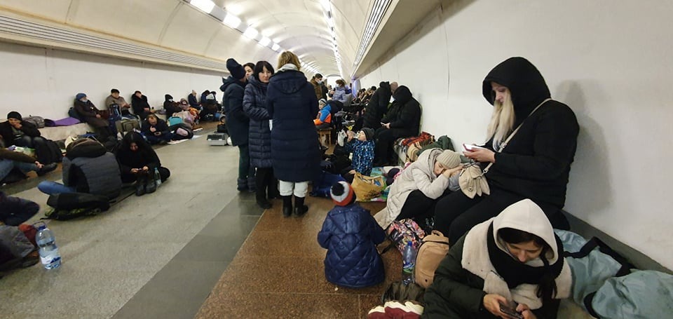 Füllen Sie verbotene Ukrainer aus, einschließlich Familien mit kleinen Kindern und Haustieren, U-Bahn-Stationen, und sahen diejenigen, die Asyl suchen, und schlafen innerhalb der U-Bahn-Fahrzeuge, die ihre einzige Zuflucht übernachten, nachdem alle U-Bahn-Bewegungen angehalten wurden.