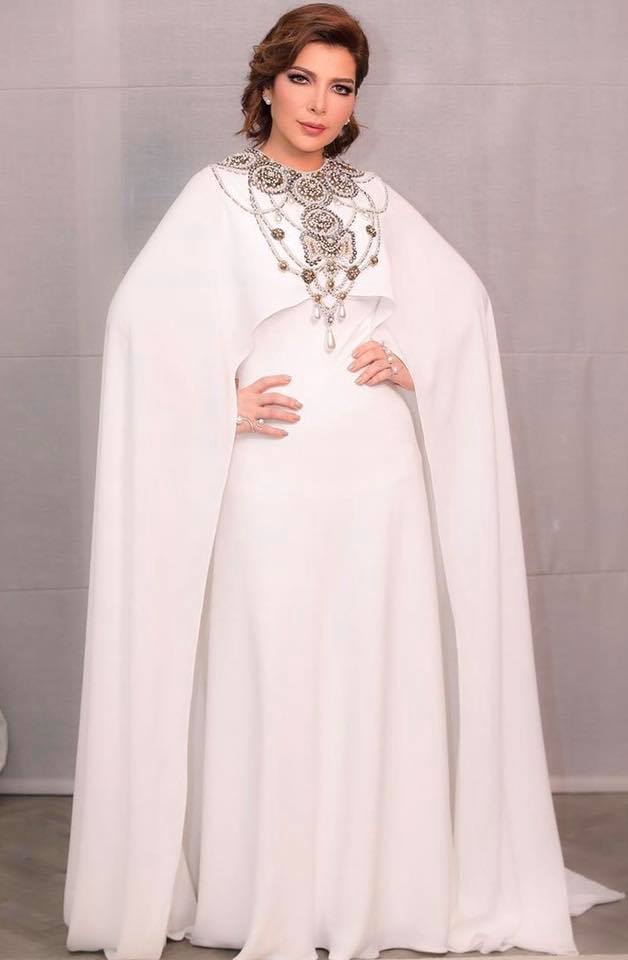 Auch bei Designer Nicolas Jubran unterzeichnet, sowie Authentizität in einem weißen Kleid in einem östlichen östlichen Kleid in Luxus. Die blinde Stickerei, die Authentizität hergestellt hat, sieht aus wie eine große Pearl-Aufgabe.