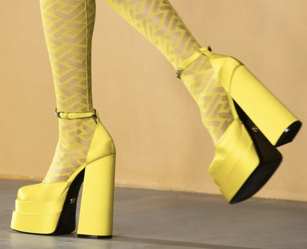 In unserer Aufzählung der Stücke von 2021 dürfen wir die hohen Schuhe auf der Plattform nicht von der italienischen Marke Versace vergessen. Dieses Stück für sechs parallele Fersen- und Quadratspitze. Diese Schuhe wurden während des Jahres an vielen Prominenten aufgenommen, was sie garantierte Werbung machte und buchstäblich getroffen wurde.