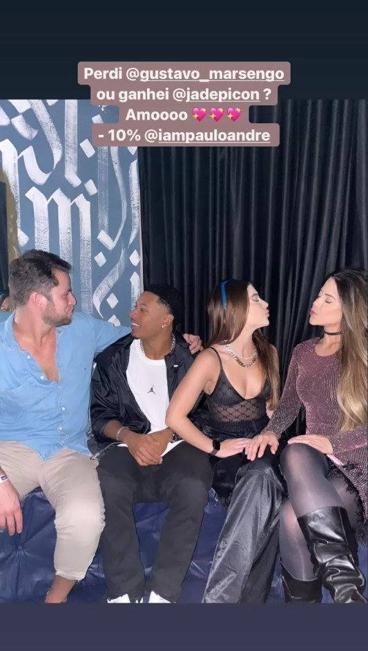 In deinenGeschichten, the doctor Laís Caldas published clicks along with her friends, joking that she would have lost her boyfriend to Paulo André. That's because Gustavo had said that every time he found the athlete, he would be 5% "less heterosexual." In the text, she wrote: “I lost Gustavo Marsengo, or did I win Jade Picon? AMOOO -10%, Paulo André ”