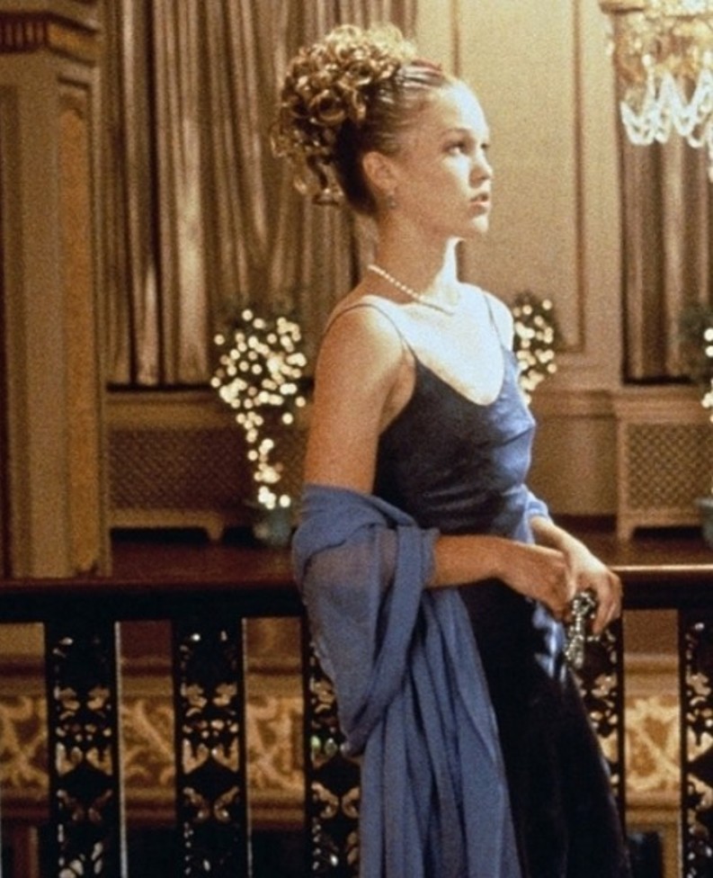 Auf der Heldin der Abschluss zog Julia Stiles ein seidenviolettes Kleid in einem Leinenstil an. Das abendliche Outfit ergänzte das Stola im Ton mit einem Kleid und einem Perlenfaden. Sein Bild kann als eines der denkwürdigsten im Kino bezeichnet werden.