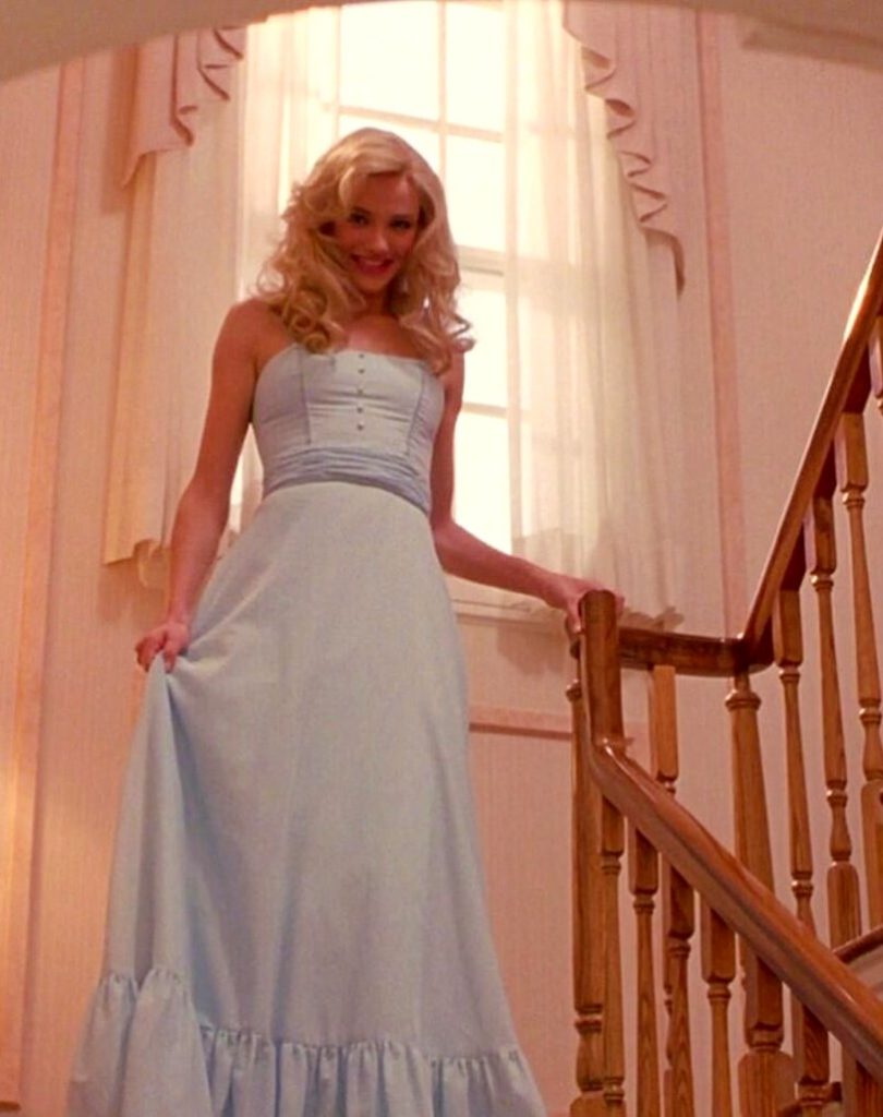 Auf den ersten Blick sieht das blaue Kleid der Heldin Cameron Diaz zu einfach aus. Es scheint aus gewöhnlichem Baumwollstoff zu bestehen. Trotz der täuschenden Einfachheit sieht das Outfit luxuriös aus. Er betont zweifellos die natürliche Schönheit von Maria.