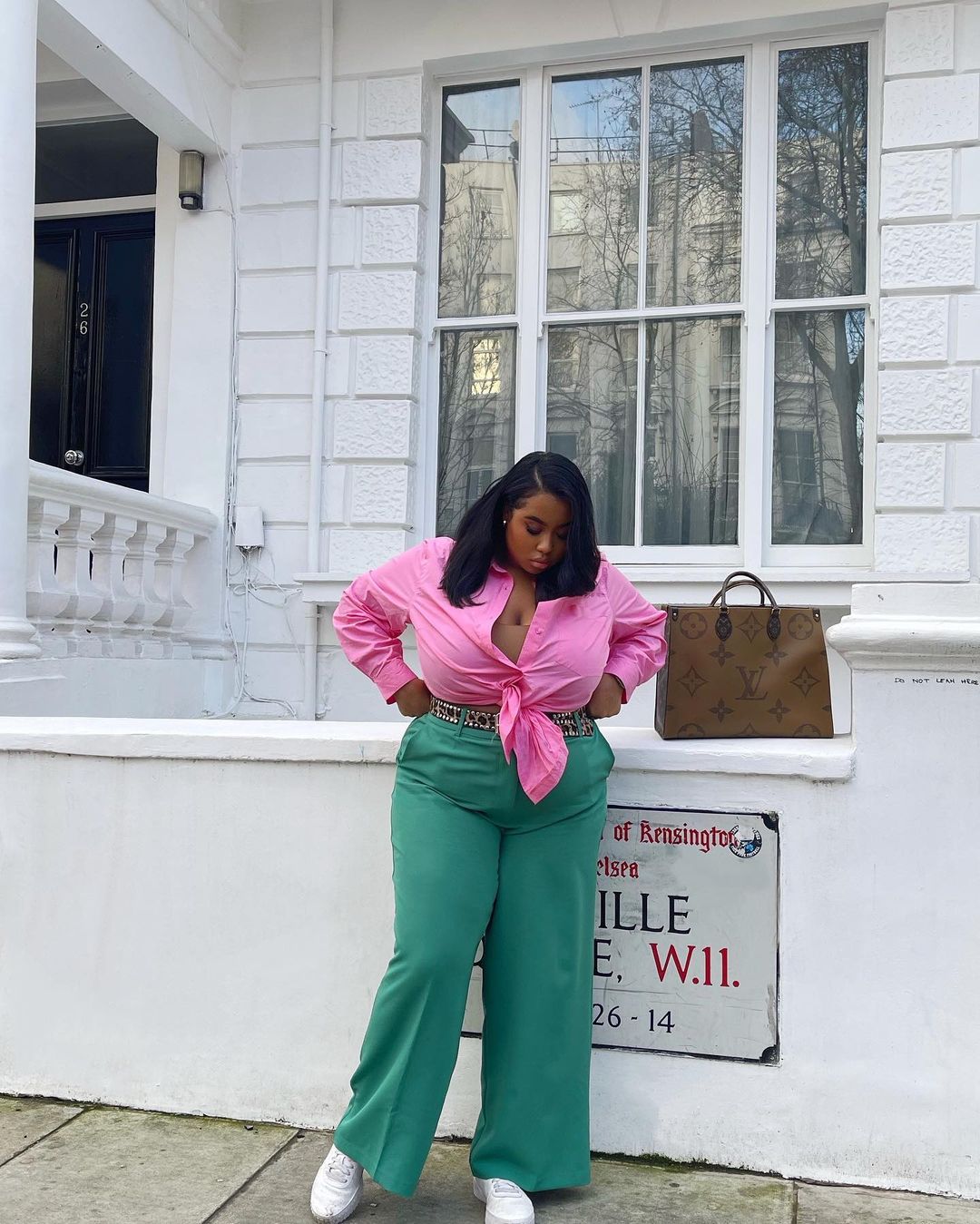 Vergessen Sie die schwarze Farbe, die viele Frauen ihre zusätzlichen Kilogramm maskieren. Krank und schlank können auch in unverwechselbaren Farben aussehen, was auch Ihr Gesicht aufhellen kann, und Sie werden in ihrer Umgebung sehr positiv aussehen. Die Grundlage des Erfolgs besteht darin, eine geeignete Farbkombination zu wählen. In diesem Fall grüne Hosen und stilvolle rosa Hemden. Darüber hinaus werden weiße Turnschuhe nichts verderben.
