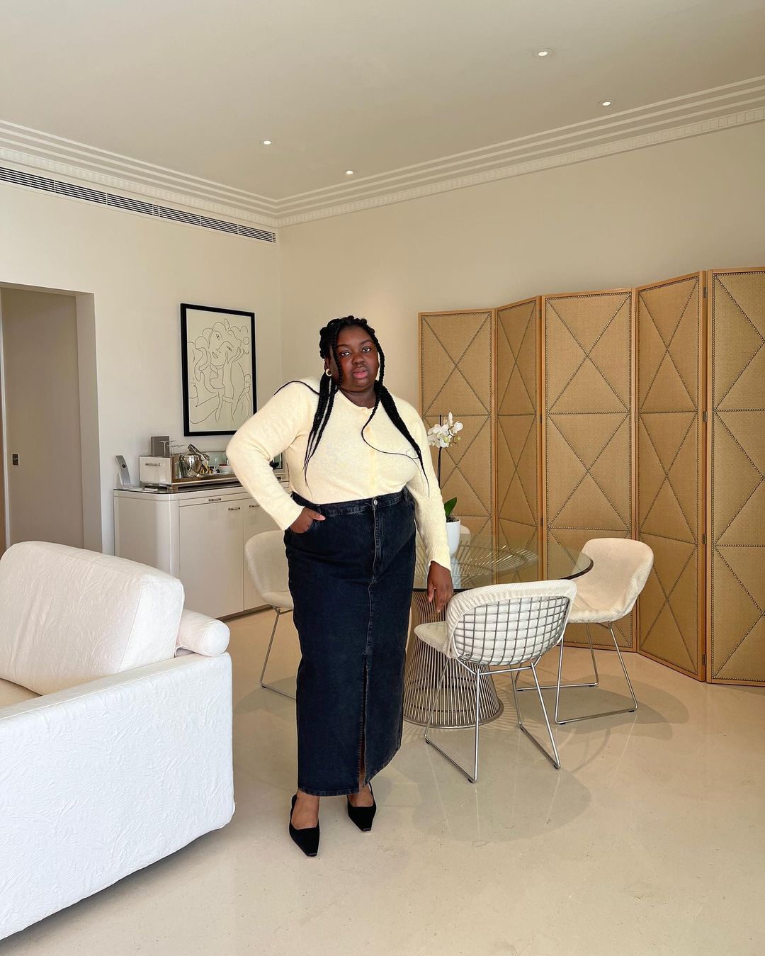 Wenn Sie zumindest einen Rock in Ihrer Garderobe haben, ziehen Sie sie auf jeden Fall dieses Jahr heraus. In letzter Zeit sind klassische Genie -Röcke in Mode gekommen - besonders in dunkleren Farbtönen. Lange Röcke können angemessen mit einfachen Tops kombiniert werden. In unserem Fall gibt es ein sehr gutes Strickoberteil, das auch angemessen durch Schuhe mit niedrigem Absatz ergänzt wird. Sie werden jedoch keine Freizeitschuhe verderben oder verwenden.