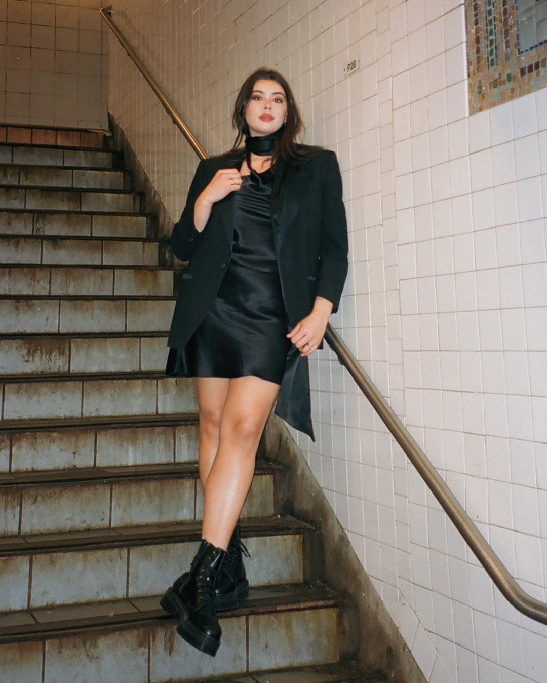 Faltenkleider sind jederzeit einfach ein Hit in Schwarz. Sie sind sehr elegant und können für verschiedene Gelegenheiten verwendet werden. Ob formelle Besuche oder einfach nur mit Freunden. Die Basis ist jedoch eine oberste Schicht, die Sie dieses Kleid abdecken. In diesem Fall beispielsweise eine stilvolle Lederjacke, die dem Modell einen leicht Felsschimmer verleiht. Wählen Sie die Jacke auf jeden Fall verkürzt.