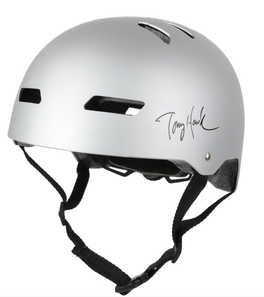 "Die Helme sind Silber mit schwarzen Trägern und einer schwarzen Schnalle. Tony Hawks Signatur wird an der Außenseite des Helms gedruckt" die obere rechte Ecke.