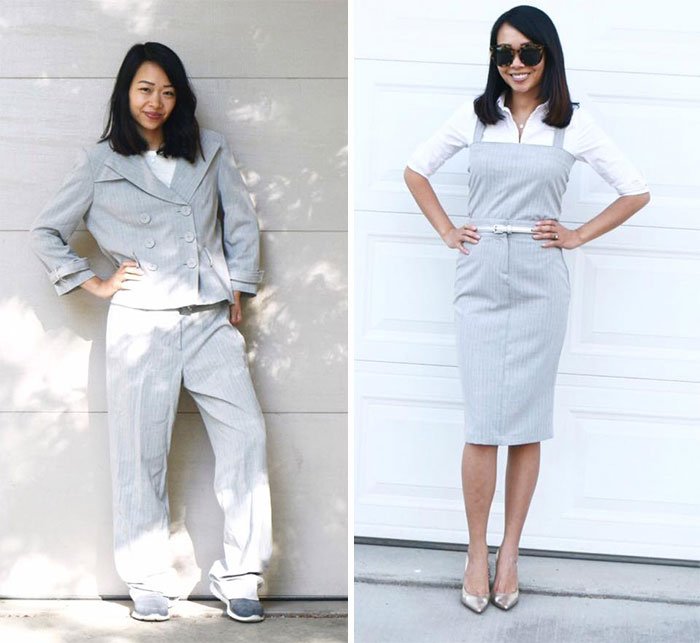 Sie schaut sich die Elemente an, die sie gerne behalten möchte, oder diejenigen, die sie aus einem sparsamen Kleidungsstück entfernen möchte, stellt sich das fertige Produkt in ihrem Kopf vor, und dann ist es nur ein Prozess, das wir Wirklichkeit werden zu lassen.