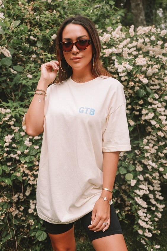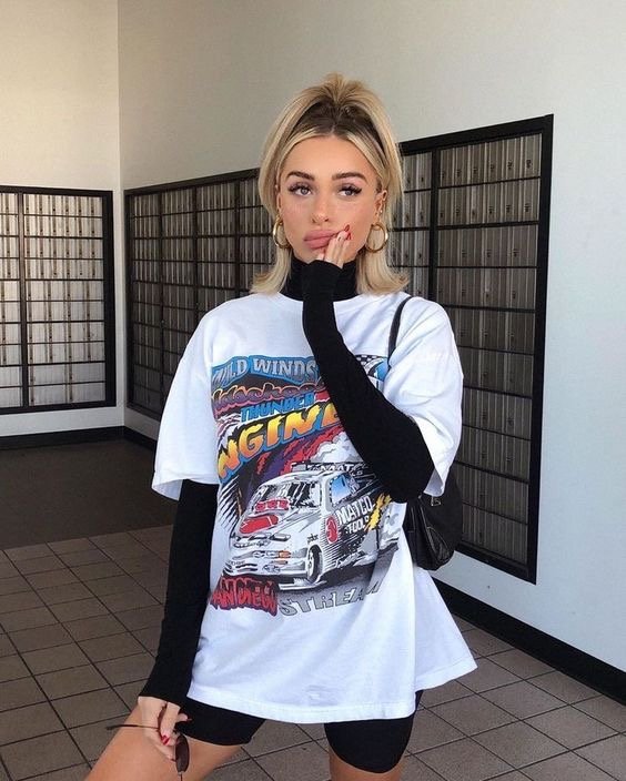 Dieser Look ist einfach, luftiger Kardashian Chic und wir lieben ihn. Entscheiden Sie sich für ein übergroßes T-Shirt (schulter sieht auch gut aus) und kombinieren Sie es mit einigen Statement-Reifen. Biker -Shorts in jeder Farbe sehen mit diesem Outfit umwerfend aus. Es sieht auch gut aus, mit einer schlampigen Frisur, Pferdeschwanz oder losen Wellen.