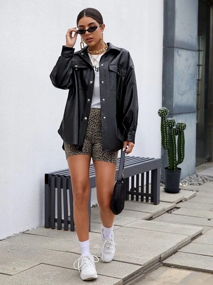 Mit Freunden zu einem Konzert oder zu einem Getränk gehen? Zeigen Sie diese gefährlichen Kurven auf unerwartete Weise - mit gedruckten Biker -Shorts. Leopardenmuster und eine schwarze Lederjacke sind immer eine zeitlose Paarung, die erhöht, aber ein wenig wild ist. Darunter zeigen Sie ein wenig Haut mit einem weißen Röhrchen -Oberteil oder einem Bandana -Oberteil.