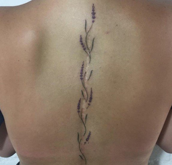 18, eine Narbe auf der Rückseite des Wirbels, wird in eine so zarte Lavendelschweinchen verwandelt, die bis zum Nacken vom unteren Rücken bis zum Nacken geht.