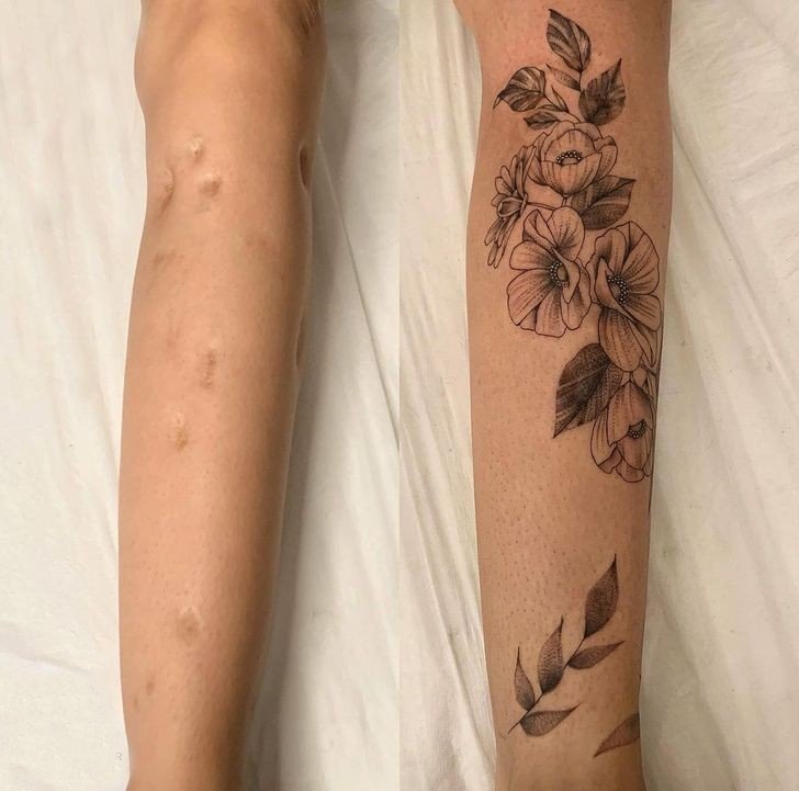 7. Ein weiteres Tattoo, das ein Beweis dafür ist, dass Blumen und Blätter mit gut gemachten Schattierungen der beste Weg sind, um Narben zu verschleiern.