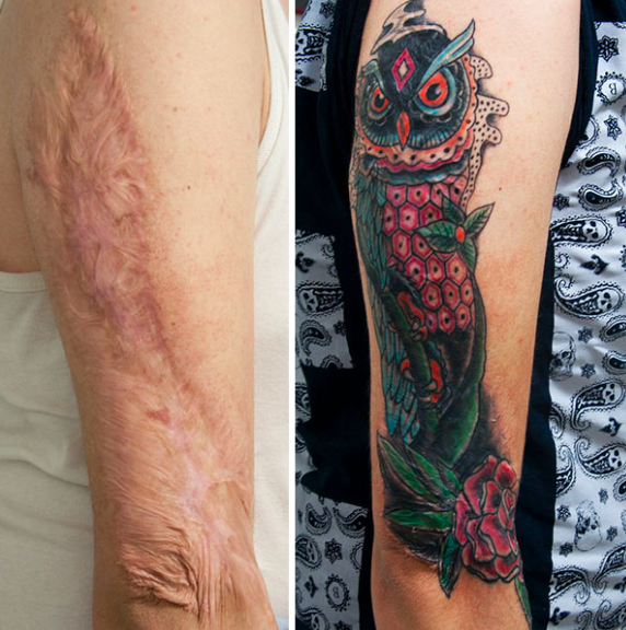 17. Jenseits von Blumen ist diese farbenfrohe und lebendige Eule eine fantasievolle Möglichkeit, eine Narbe zu vertuschen, die eine große Menge an Immobilien einnimmt.