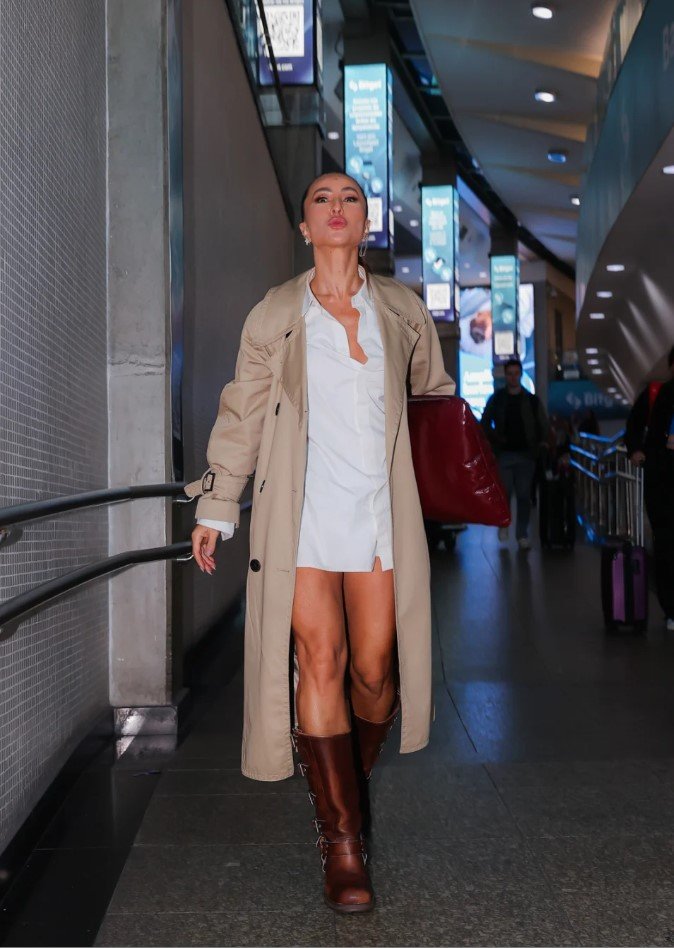 Am 1. September wurde Sabrina Sato wieder am Flughafen Santos Dumont in Rio de Janeiro mit einem landetsehen um das Kinn zu fallen. Der Wirt hatte einen Twill -Overall, der die Overalls erinnerte, die von Mechanik getragen wurden, ihr Haar in einer schwarzen Mütze, einer Sonnenbrille und einem sehr hohen Schuh gebunden war, der die Augen auffiel.