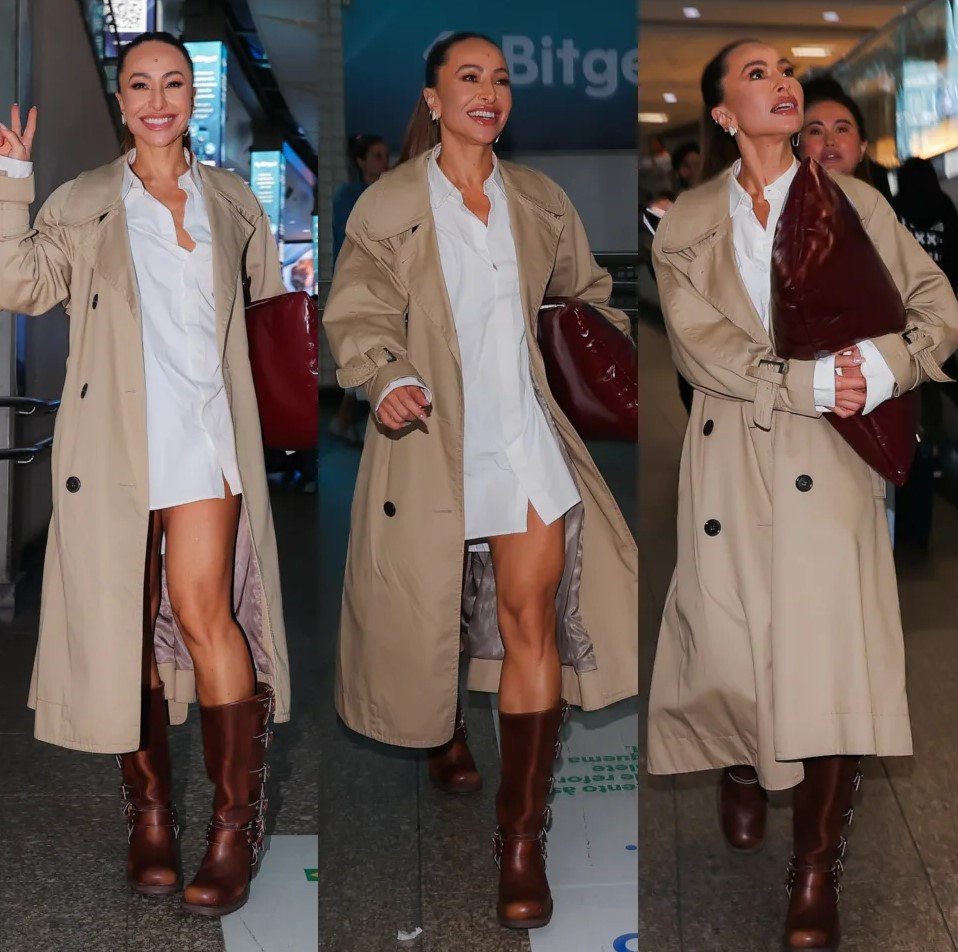Sabrina Sato ist bekannt für ihren Vorstellung von Mode, der immer mit den unterschiedlichsten Stilen vorgegangen ist und immer eine Show gibt. Mit der Kombination von Mantel und Stiefel zeigte sie ihre gebräunten Beine - aber was wirklich zu sagen hatte, war die Kissenbeutel.