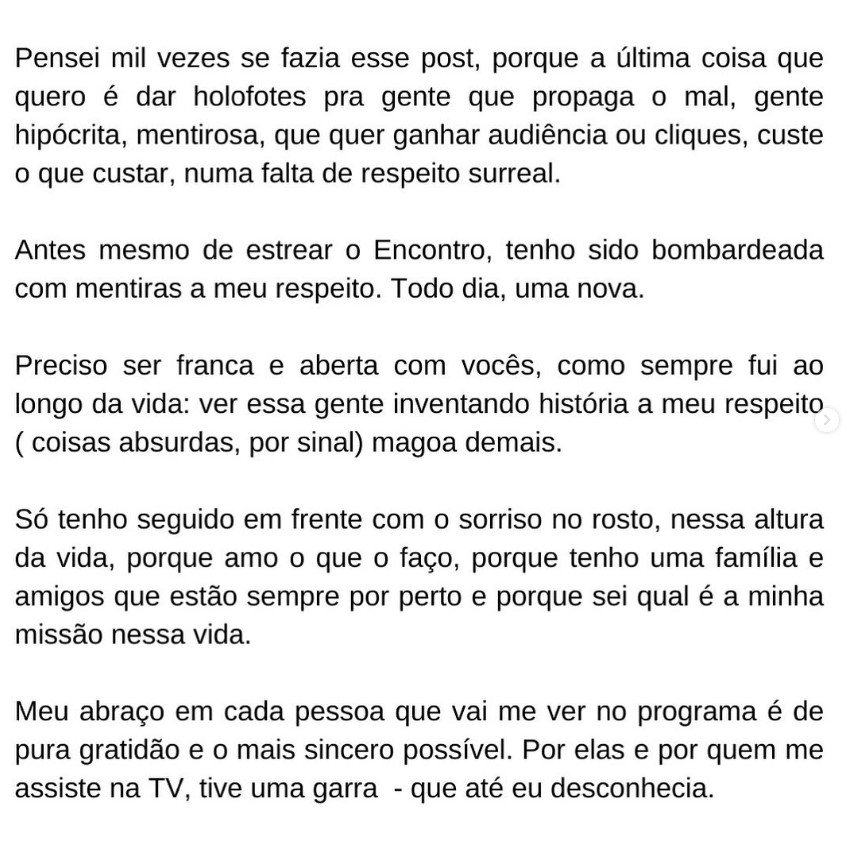 Die Rede des Journalisten kam, nachdem der Dichter die Stille gebrochen hatte und einen offenen Brief auf seinem Instagram veröffentlichte, um alle Gerüchte zu stoppen, dass sie mit Manoel Soares Brigade sein würde. In dem Text bedauerte sie, das Opfer von Lügen zu sein und Geschichten erfunden zu haben, und dass sie mit all dem zu sehr weh tut.
