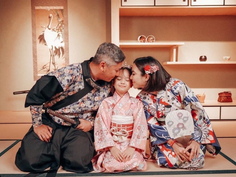 Gading trägt einen Kimono für einen Mann namens Kinagashi, komplett mit Samurai -Schwertattributen. Während Gempi und Gisel schöne rosa und blaue Kimono tragen. Gading und Gisel schienen kompakt zu sein, sich einer Fotosession zu unterziehen, als würde sie sich entscheiden, in eine glückliche kleine Familie zurückzukehren.