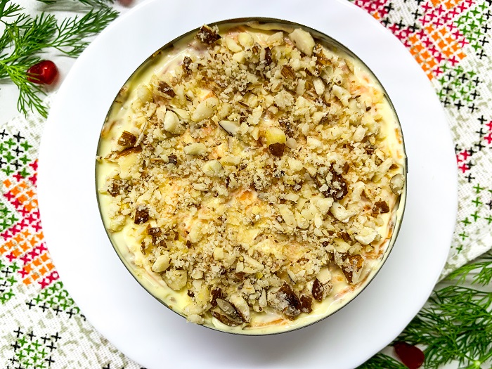 Die zweite Schicht ist Hühnerwürfel. Dann eine Schicht Eier. Der vierte ist eine fein geriebene gekochte Karotte. Die Walnüsse in einem Mörtel oder einem Messer mahlen und mit dem letzten Hub bestreuen. Vergessen Sie nicht, jede Schicht des Gerichts mit Mayonnaise zu summieren und zu schmieren.