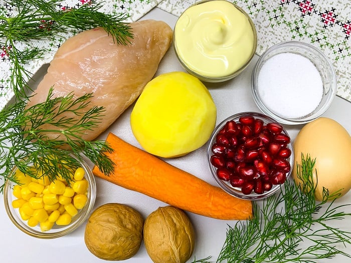 Um einen Salat zuzubereiten, brauchen Sie Fleisch (wir nehmen Hühnchenfilet), Eier, Kartoffeln, Karotten, Mais, Walnüsse und Granaten. Puffsalat, Mayonnaise zum Auftanken verwenden.