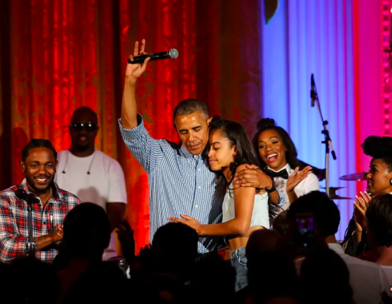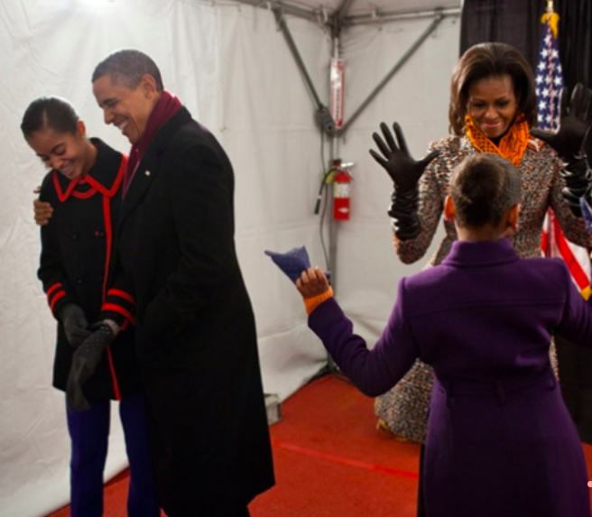 Bis 2012 fühlten sich die Mädchen mit dem öffentlichen Auge und den Kameras jederzeit natürlicher und komfortabler. Aus Malias Haltung auf diesem Bild ist klar, dass sie auf dem Weg zum Aufwachsen und Reifen ist. Dieses Bild zeigt auch etwas Liebe zum Familienhund der Obamas, der leider im Jahr 2021 verstorben ist.