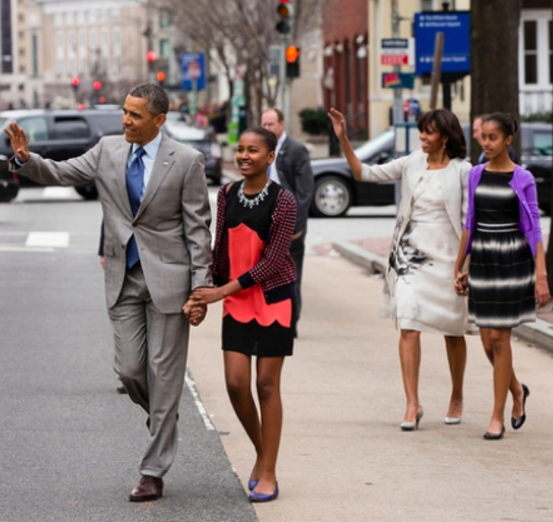 Während viele Kinder beschämt wären, ihre Väter als Teenager an den Händen zu halten, ist es klar, dass diese beiden überhaupt nicht von ihren sehr versierten Eltern verlegen sind. Auf dem Weg zu einem Ostergottesdienst in der Kirche im Jahr 2013 hält Sasha die Hand ihres Vaters und Malia hält die ihrer Mutter und alle lächeln!
