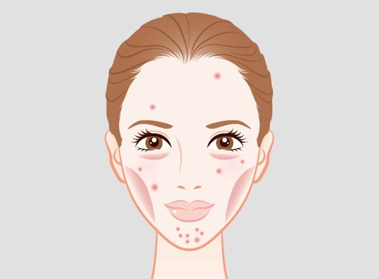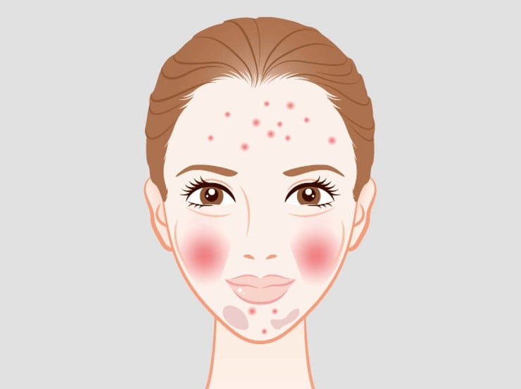 Schwollen rote Wangen, Akne auf der Stirn, dunkle Pigmentflecken am Kinn.