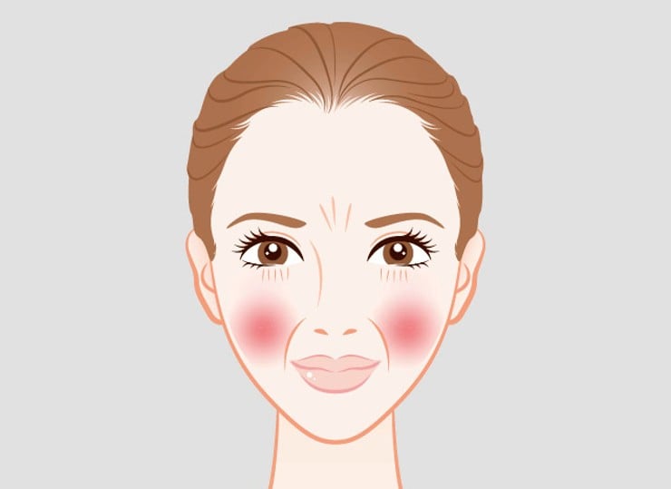 Schwere Falten oder Rötungen zwischen den Augen, abgesenkten Augenlider, erweiterten Poren, dehydrierter Haut, rotem Wangen und Nase, tiefen nasolabialen Falten.