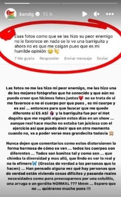 Karol G wies darauf hin, dass der Zweck des Fotos im Gegensatz zur Meinung der Kommentatoren nicht den Rest war, sondern dass sein Körper das ist, was es ist und es nicht ändern kann.