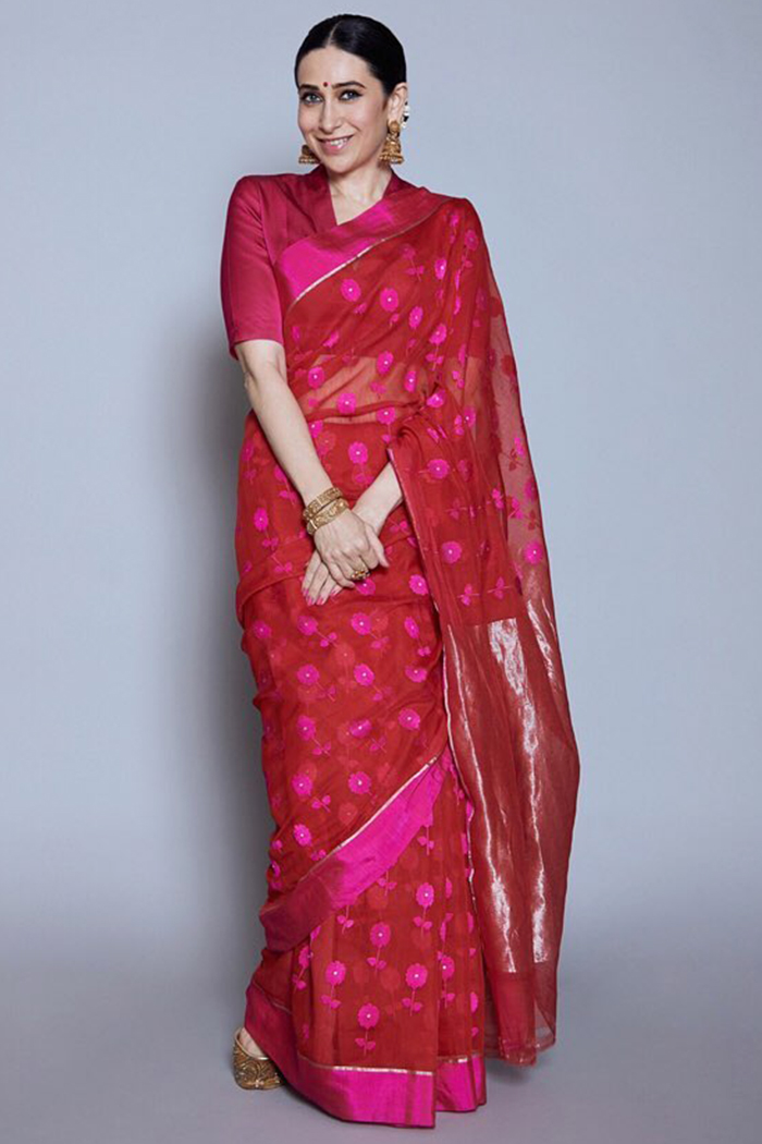 Karishma sah in einem roten Saree, der einen Druck aus kleinen rosa Blüten hatte, verführerisch aus. Sie trugen es mit einer tiefen Gitterbluse, Ohrringen, Bindi, Make -up und einem Top -Brötchen.