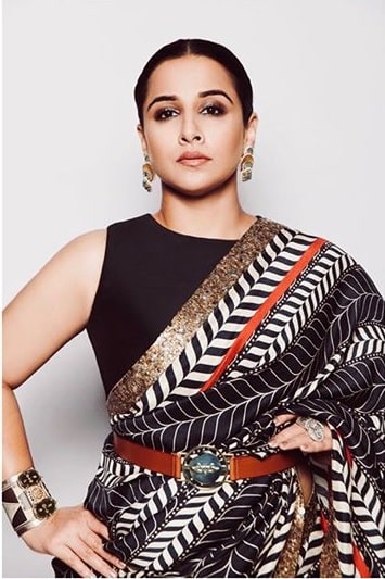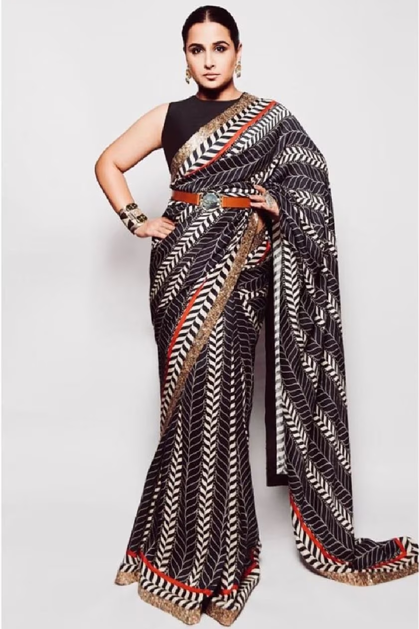 Vidya begann in einem schwarz -weißen gedruckten Sari mit Gold und Rot zu schwärmen. Sie trugen es mit einfacher Bluse, Taillenband, Ohrringen und schlankem Brötchen.