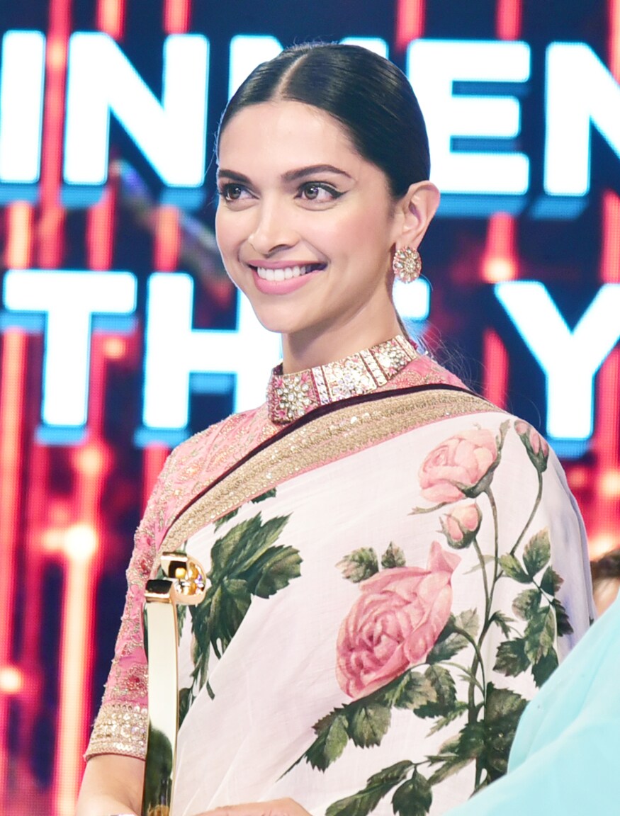 Deepika erkannte Schönheit in einem weißen Saree mit rosa Druck. Sie trugen es mit rosa gestickten Blusen, Bolzenohrringen, Make -up und einem schlanken Brötchen.