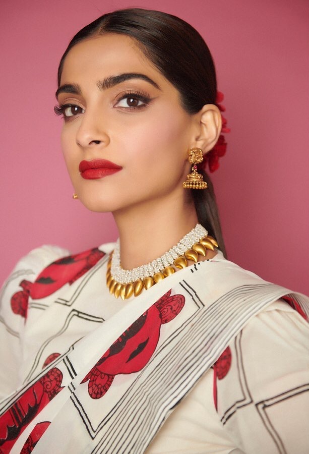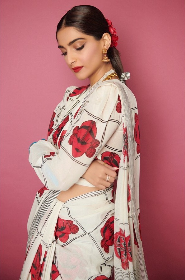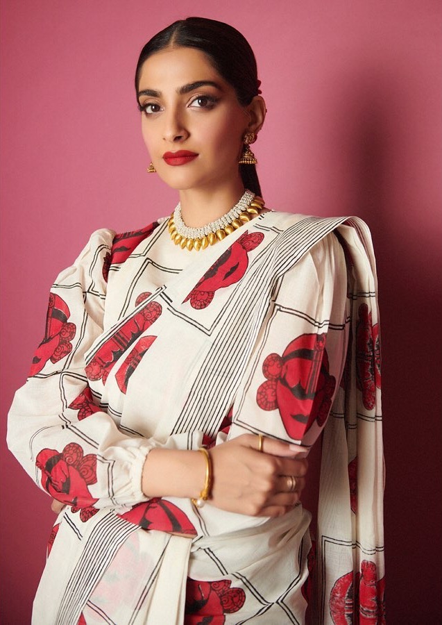 Sonam machte einen Stilstil in einem weißen geprüften Saree mit einzigartigen Drucken. Sie trugen es mit Ärmelblusen, Goldschmuck, roten Lippen und schlankem Haar.
