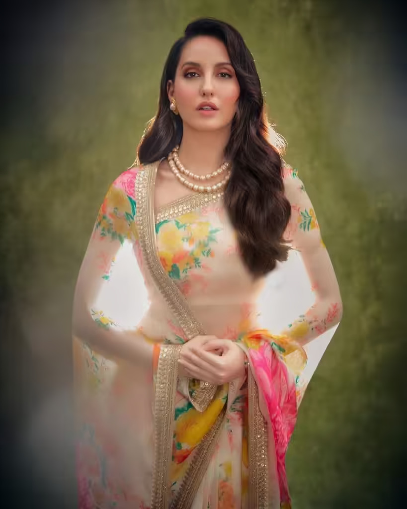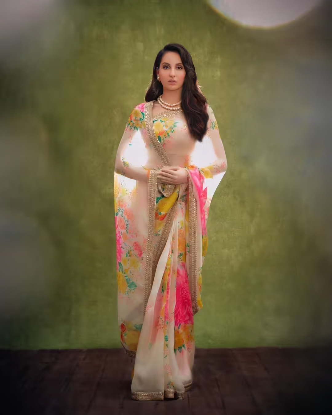 Nora sah in einem weißen Sari mit Blumendruck und schlanken Kanten wunderschön aus. Sie trugen es mit einfacher Bluse, Perlengirlande, Stollenohrringen, minimalem Make -up und offenem Haar.