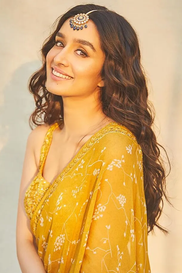 Shraddha trug einen gelben Saree mit einem Druck und einem Blumenspiegel. Sie trugen es mit gestickten Blusen, Nachfrage-Tikas, Armreifen und hervorgehobenem Make-up.