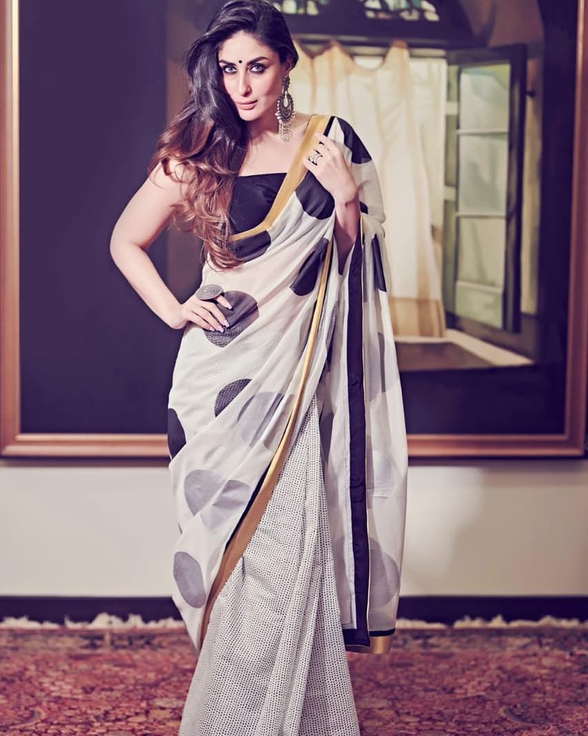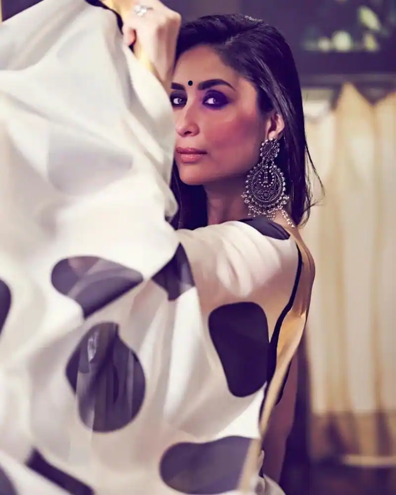 Kareena trug einmal einen weißen und schwarzen bedruckten Saree, auf der Seite golden war. Er trug es mit einer schwarzen Bluse, oxidierten Ohrringen, Bindi, rauchigen Augen und nacktem Lippenstift.