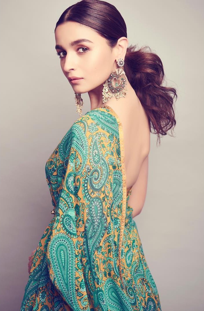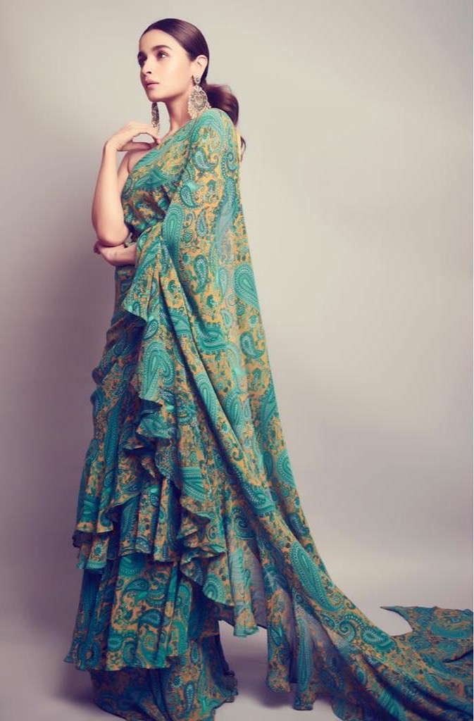 Alia trug einen grünen und gelben Print Saree. Er trug es mit einer schulterfreien Bluse, Chandbaliyan, hervorgehobenem Make-up und einem schlanken Pferdeschwanz.