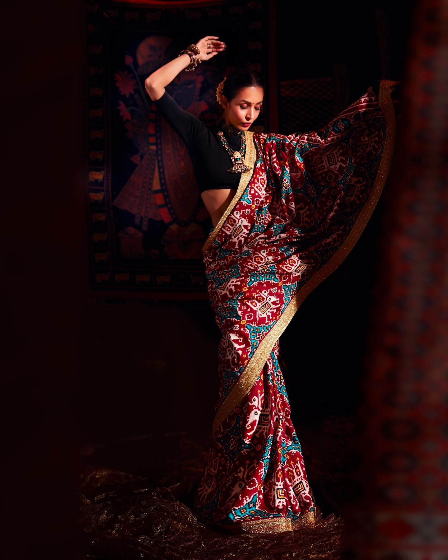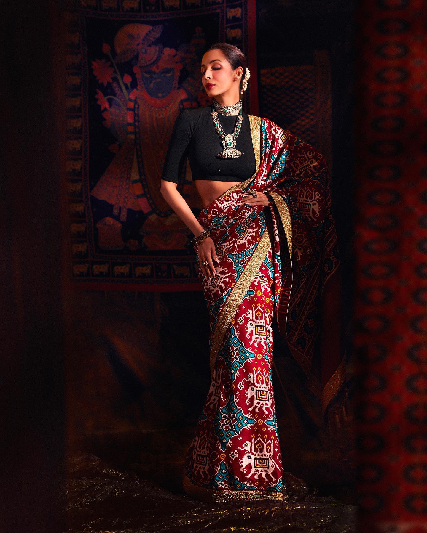 Malaika trug einen roten Sari aus goldfarbenem. Sie trugen es mit schwarzer Bluse, schuppig oxidierter Halsketten und glamouröses Make -up.