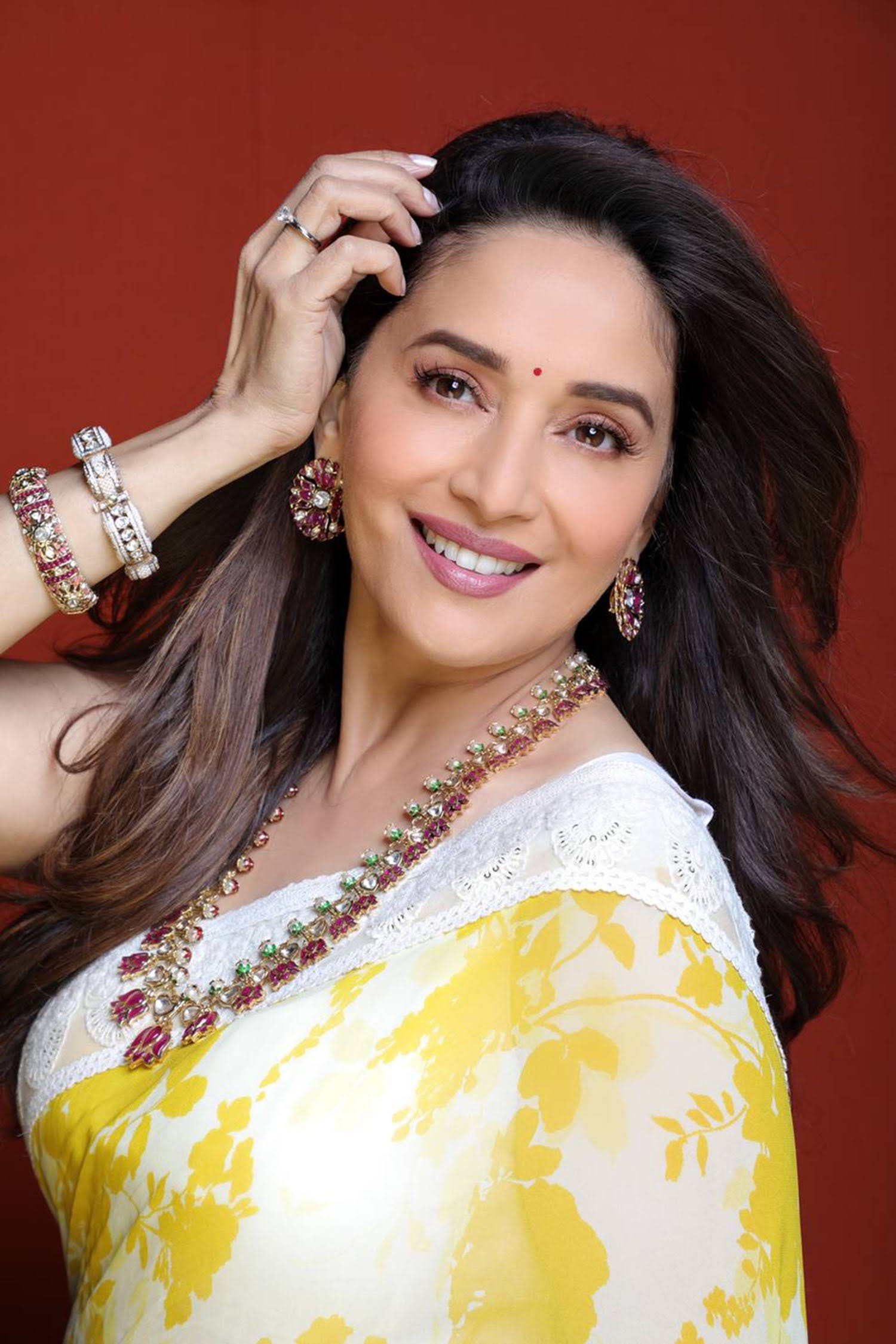 Madhuri sah in einem weißen und gelben bedruckten Saree wunderschön aus, der mit Pfanne geschmückt war. Sie mischten es mit einer einfachen Bluse, einer Edelstein- und Diamantketten und Ohrringen.