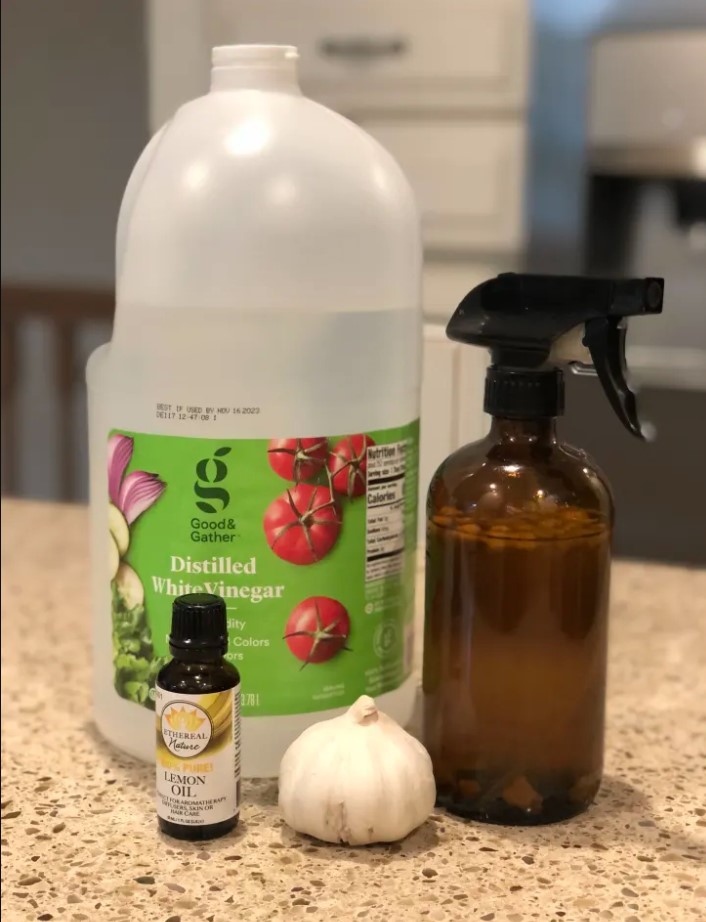 - 2 Köpfe zerknitterter Knoblauch, 1 Tasse Alkoholessig und 1 Tasse Wasser in einer Glasvase geben;