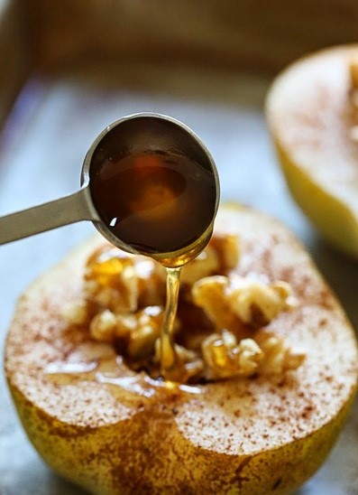 Frische, saftige Birnen schmecken gegrillt noch besser. Die Birne halbieren und die Kerne herausschneiden, sodass in der Mitte ein Platz entsteht. Als nächstes müssen Sie etwas Zimtpulver auf die Oberfläche der Birne streuen und die zerkleinerten Walnüsse in die Mitte der Birne geben. Zum Schluss müssen Sie nur noch ein wenig Honig darüber träufeln und den Kuchen 15 Minuten lang backen, um ein köstliches Dessert zu erhalten. Alternativ können Sie Birnen auch mit etwas Olivenöl beträufeln, um sie zu backen und zu Desserts wie Eis oder herzhaften Gerichten wie gegrillten Schweinekoteletts zu genießen.