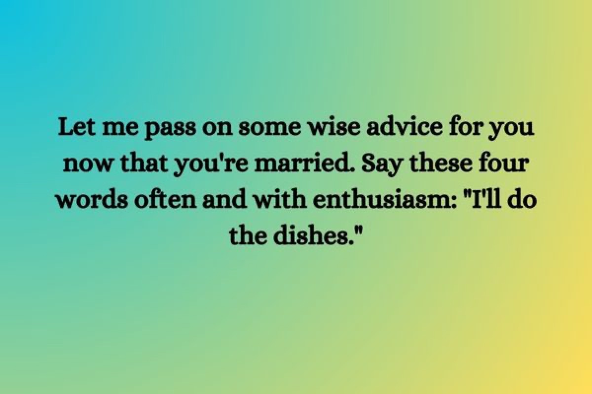 - Lassen Sie mich einige kluge Ratschläge für Sie weitergeben, nachdem Sie verheiratet sind. Sagen Sie diese vier Wörter oft und mit Begeisterung: "Ich werde das Geschirr machen."