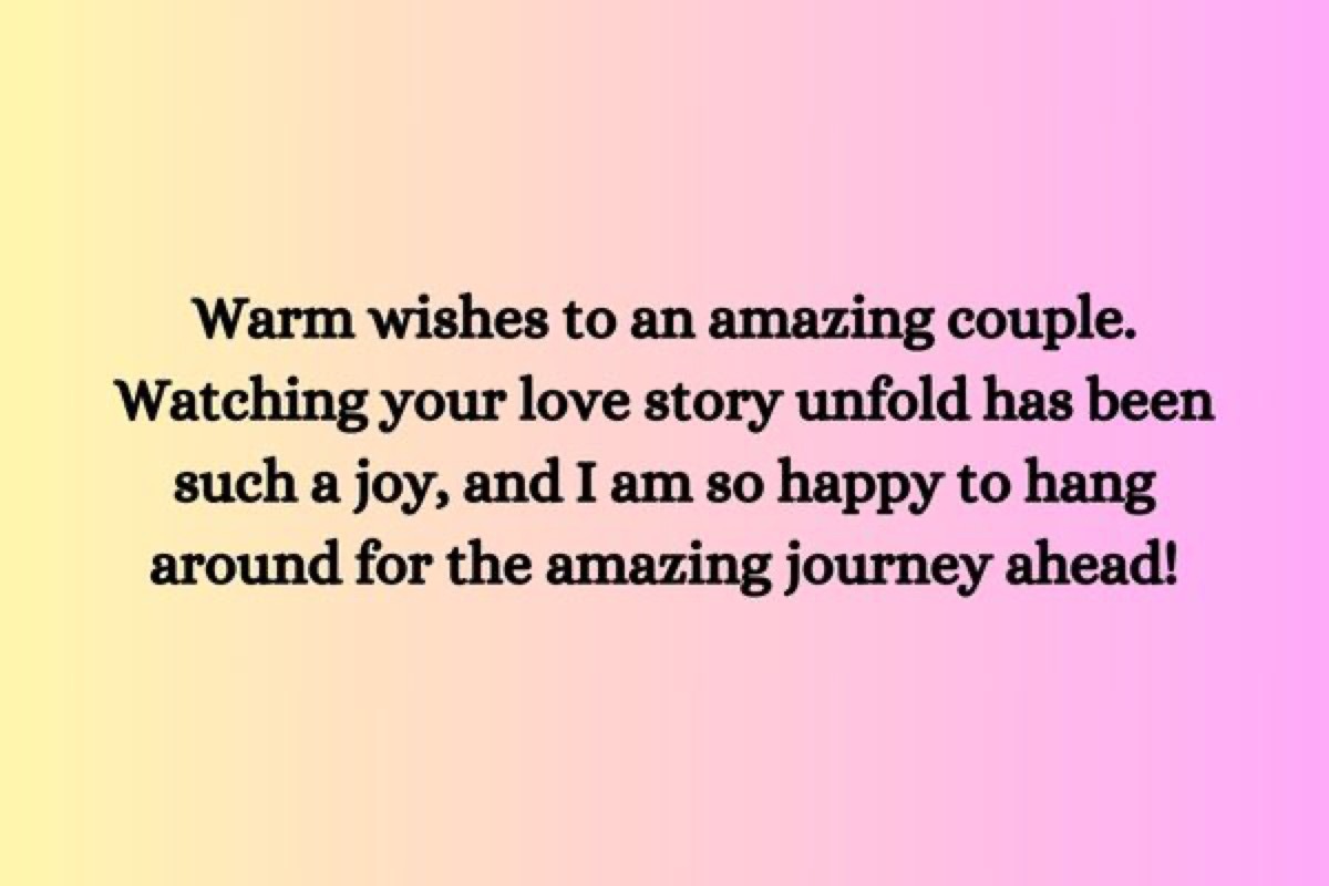 - Warme Wünsche an ein tolles Paar. Es war so eine Freude, Ihre Liebesgeschichte entfalten zu sehen, und ich bin so glücklich, für die erstaunliche bevorstehende Reise herumzuhängen!