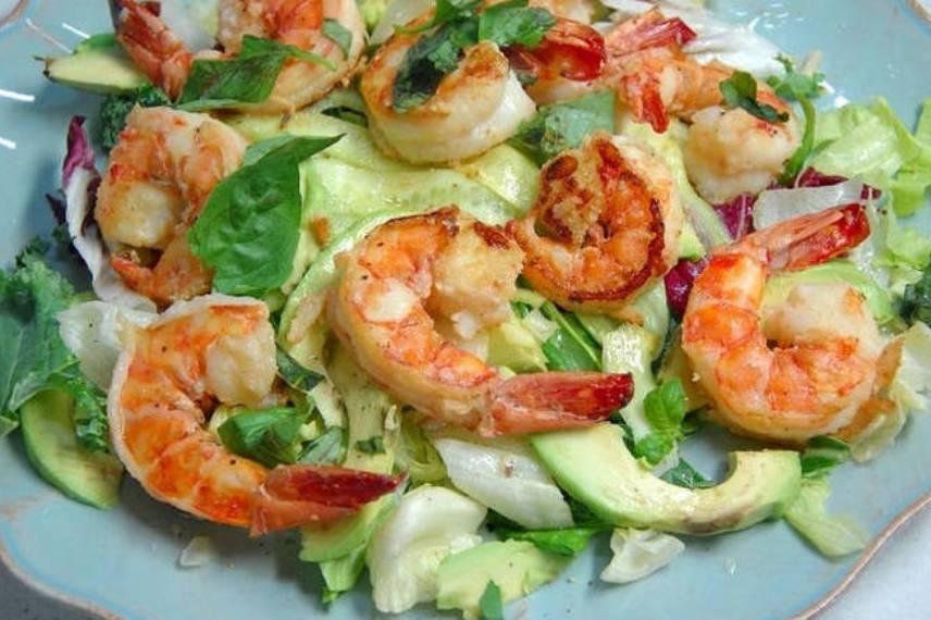 Mischen Sie 2 Handvoll Salatmischung, geschälte und gehackte Gurke, Avocado -Scheiben. Salz, Pfeffer, mit Zitronensaft und Olivenöl bestreuen. 10 Garnelen in einer Pfanne mit Zitronensaft braten. Legen Sie eine Salatschüssel auf das Gemüse. Gießen Sie flüssigen Honig. Dekorieren Sie vor dem Servieren mit den Blättern von Basilikum und Minze.
