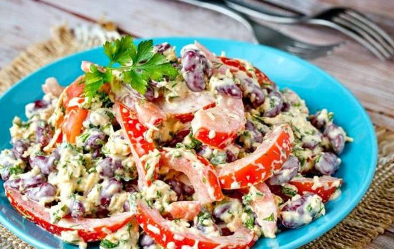 Ein Stück Käse, ungefähr 70 Gramm, mit kleinen Löchern reiben. 250 Gramm süße und saftige Tomaten mit Scheiben schneiden. Drücken Sie einen Knoblauchzehe durch die Presse. Öffnen Sie die Dose von Bohnen in Dosen und lassen Sie die Flüssigkeit vor. Mischen Sie in der Salatschale alle vorbereiteten Produkte. Den Salat mit Mayonnaise, Salz zum Geschmack würzen und zerkleinertes Grün hinzufügen.