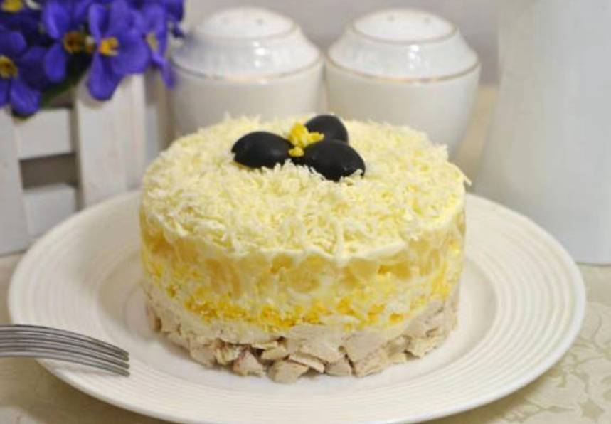 Nehmen Sie 250 g gekochtes Hühnchenfilet, 2 Eier, 3 Ringe Dosenananas, 70 Gramm Käse und Mayonnaise. Schneiden Sie das Huhn und die Ananas mit kleinen Würfeln, reiben Sie Eier und Käse mit kleinen Löchern. Legen Sie die Zutaten in Schichten. Jedes Schicht ist ein wenig Salz und Fett mit Mayonnaise. Vor dem Servieren kann der Salat mit Oliven dekoriert werden. Guten Appetit!