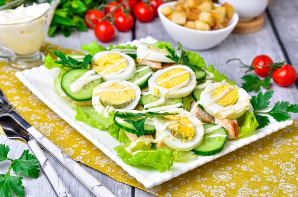 Sie benötigen 250 g gekochtes Hühnchenfilet, 2 Eier, Gurke, Mayonnaise und ein paar saftige Salateisberg oder Fries. Nehmen Sie ein flaches Gericht. Die Blätter des Salats mit den Händen zerrissen. Legen Sie die gehackten Hühnerfilets, Gurkenkreise und Eier darauf. Seien Sie den Salat mit Mayonnaise. Wenn Sie nicht genügend pikantische Noten haben, fügen Sie mit Federn rote Zwiebeln zum Salat hinzu.
